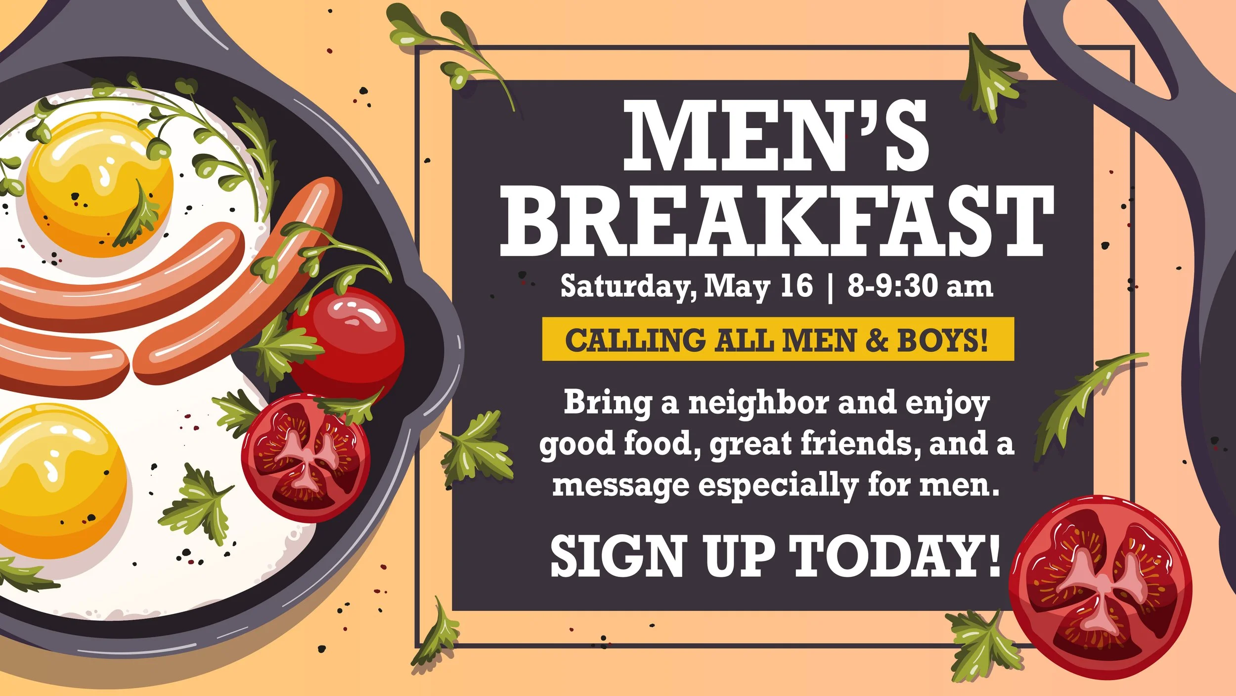 Saturday, May 16 from 8-9:30 am. We're serving up breakfast, and so much more, at Waypoint. Men and accompanied boys are invited to enjoy a delicious breakfast, meaningful message, and an opportunity to kick back and enjoy time with other guys. Sign up today so we'll have plenty of food.