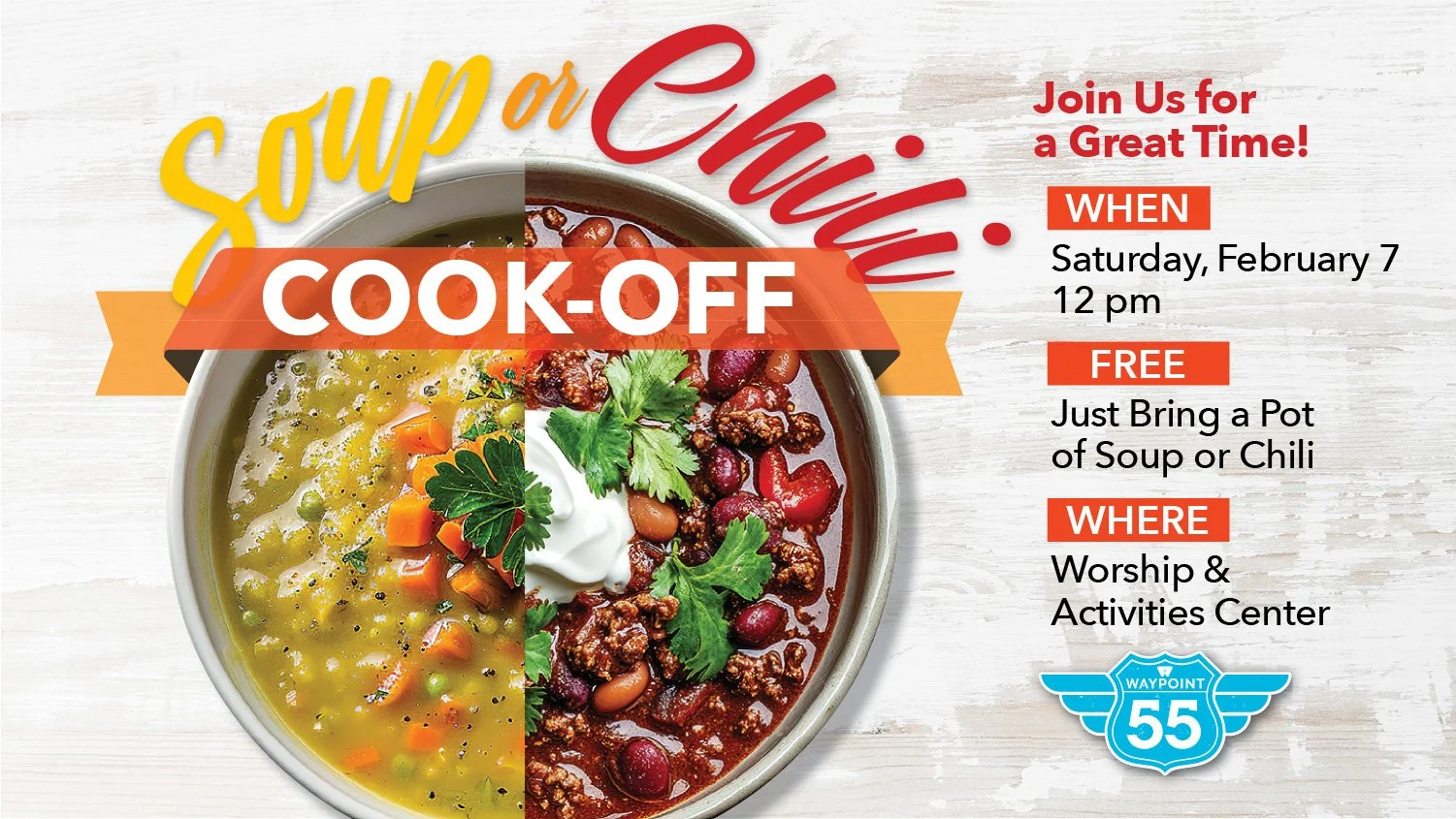Sunday, February 22. Another delicious lunch with friends and family at Waypoint! First we’ll worship all together ... adults and kids, kindergarten and up. Then we’ll enjoy lunch right after church. We'll be having Soup, Salad, Sandwiches, and Sweets! We'll bring the salad, sweets, and drinks. You bring the soup or sandwiches. Sign up so we’ll know how many to prepare for..