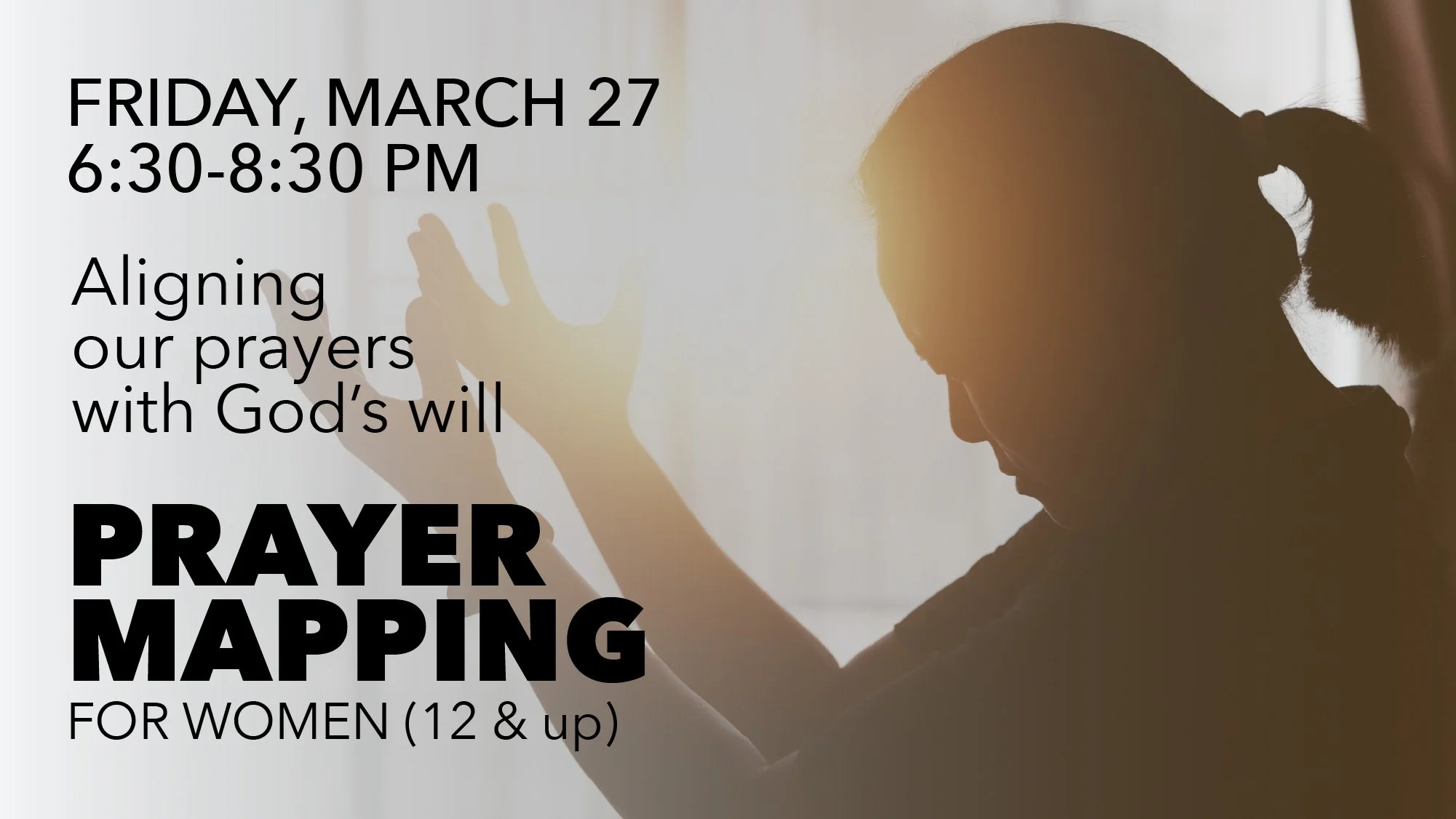 Friday, March 27 from 6:30-8:30 pm. When we align our prayer life with God’s will, we pray, believe, and move forward with Him! Learn to organize your prayer life around the Word of God, remember God’s faithfulness, and surrender your path to Christ. No cost. Light refreshments will be served. Sign up today.