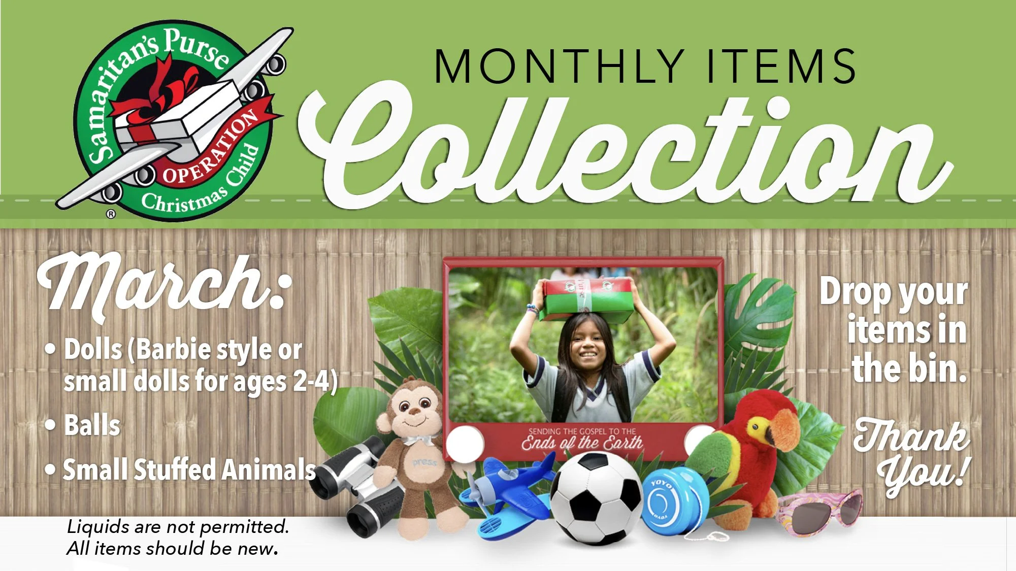 Now you will be able to participate in Operation Christmas Child every month! We are collecting specific items each month so our awesome OCC team can be packing shoebox gifts throughout the year. Download an item list today and drop your items off in the Waypoint Welcome Center on Sunday. Thank you for helping to send the gospel to the ends of the earth!