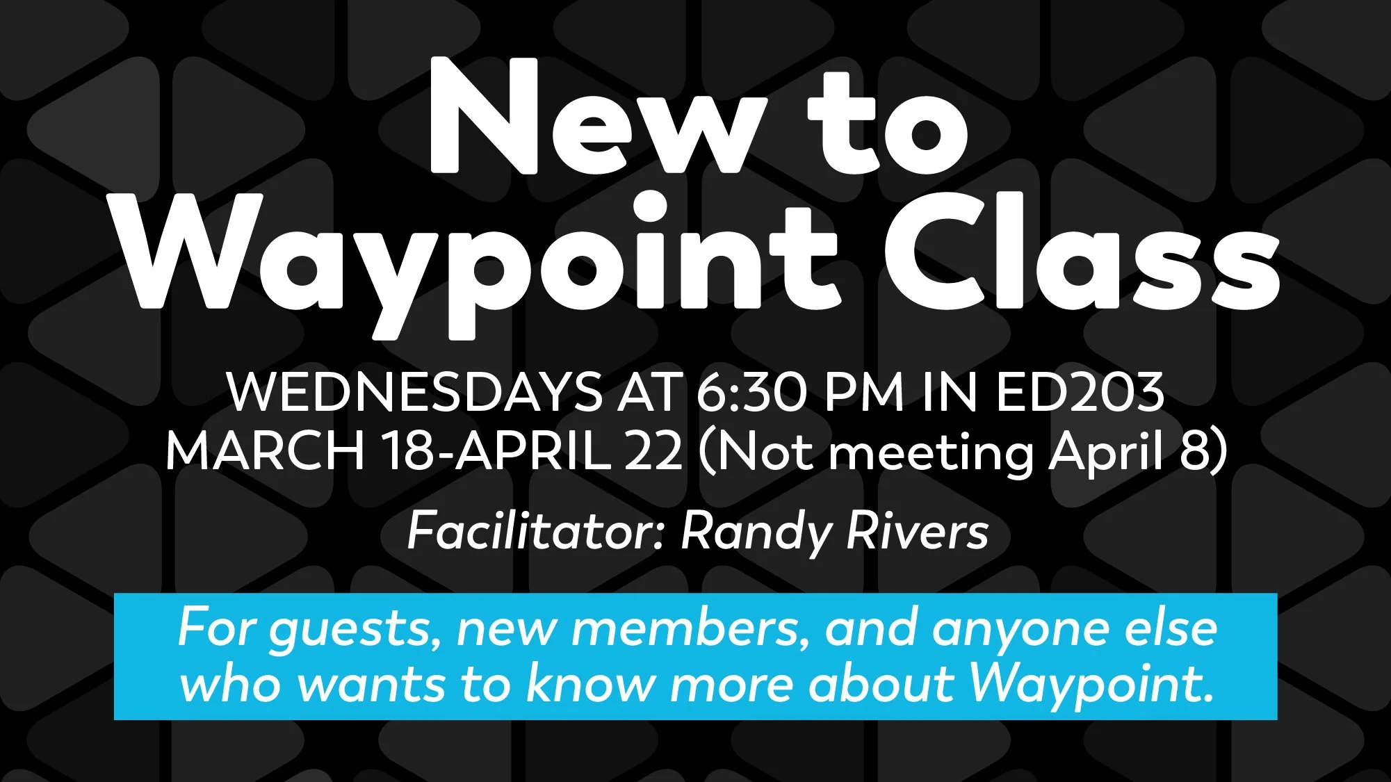 Wednesdays at 6:30 pm beginning March 18. This five-session class is for anyone who would like to learn more about Waypoint and who we are. We will not meet April 8 (spring break). Facilitator: Randy Rivers. Sign up today.